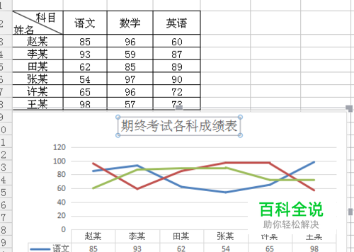 5.此时表格下方就会出现一个折线图,双击图表标题进行重命名,然后点击右侧的图表元素,可以具体设置图表的详情。如图