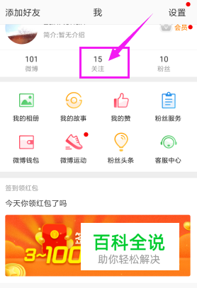 点击【关注】,如图。关注这里有显示我们现在关注了多少个微博号。