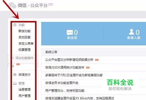 基本功能的首要菜单栏都在左侧,右侧是相关内容;微信小编们经常用到的就是前两块,即功能和管理,以及下拉菜单栏处的设置。作为初学者,下方的设置最好提前做好。