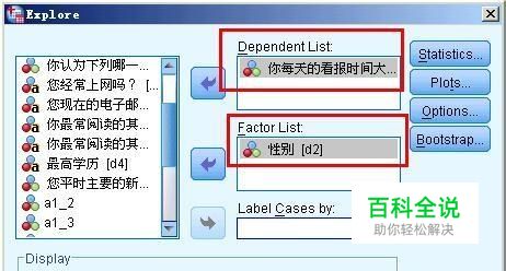 将每天的看报时间放到因变量列表,将性别放到因素量表(点击添加按钮可以添加因素