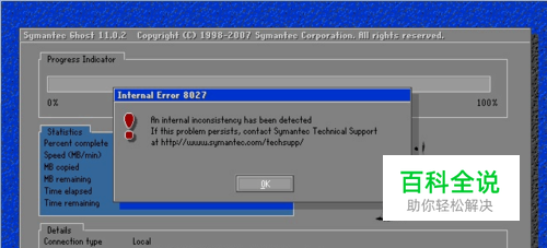 “An internal inconsistency has been detected”的中文意思是“检测到一个内部不一致性错误,如果这个问题一直持续,请与技术支持中心联系”,一般出现在复制镜像文件“文件.GHO”快结束时弹出来,一旦出现此问题,就意味着我们这次重装系统没有成功,出现错误,不是很常见。有时也伴随着“Output error file to the following location,A:/GHOSTEER.TXT”一起出现。