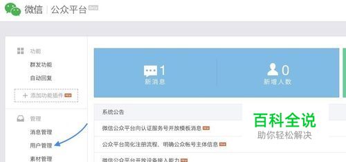 先请登录自己的微信公众号,点击页面左侧的 “用户管理”选项,如图所示