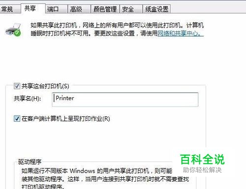 在共享选项下面选择共享此打印机,记住它的名称,呆会添加的时候就可以认出来,或者给它改个名也可以。