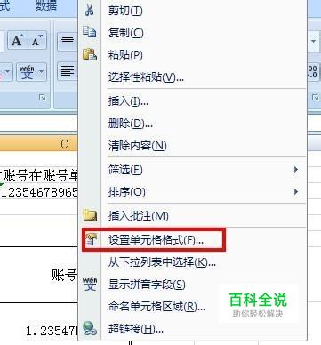 首先,在需要显示账号的地方单击鼠标右键,在弹出菜单里选择“设置单元格格式”,如下: