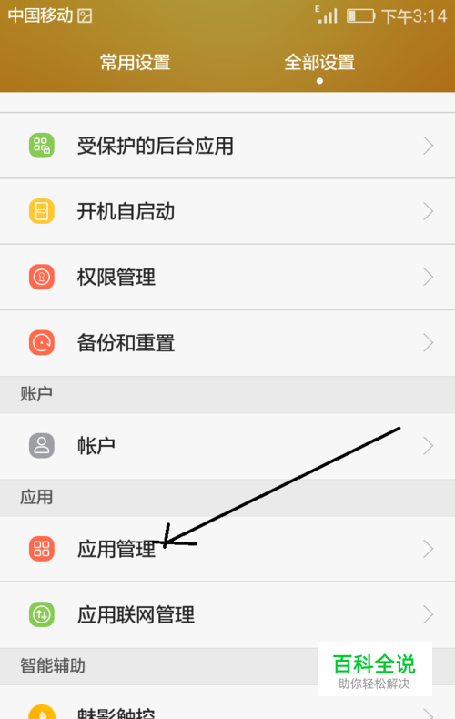 打开手机设置界面选项下点击全部设置选项卡中找到点击应用管理选项。