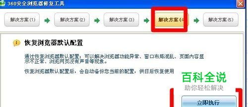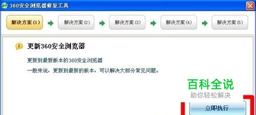 在360浏览器里按住F1进入360浏览器修复页面。选择解决方案(1)点击立即执行。这个时候会把360浏览器升级到最高版本,但是不一定能解决,还有进行下一步。