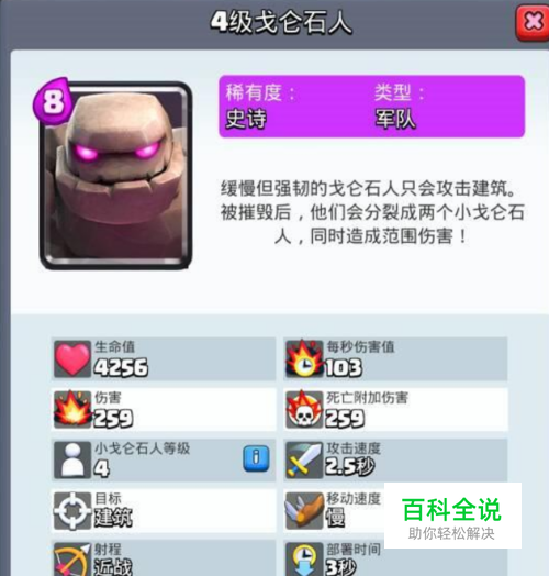 戈仑石人是一张6阶竞技场解锁的史诗卡牌,并且费用较高(8费),攻击目标为建筑,并且死亡后会对周围造成爆炸伤害,可以产出2个小戈仑石人,所以这张卡牌有着非常高的血量和很强的压制性。