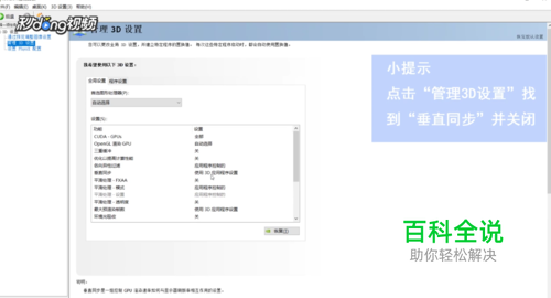 在出现的页面左侧点击管理“3D”设置,找到垂直同步并关闭。