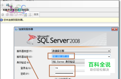 首先打开你安装好的SQL Server management studio,注意数据库所在的服务器地址,输入SA与密码连接。