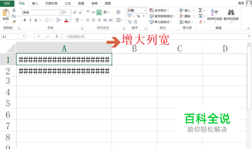 增大列宽。 鼠标放在两列最上面的头部之间,光标由箭头形状变成可拖动的形状,往右拖拽鼠标,直至单元格的内容由井号变成正确的内容。