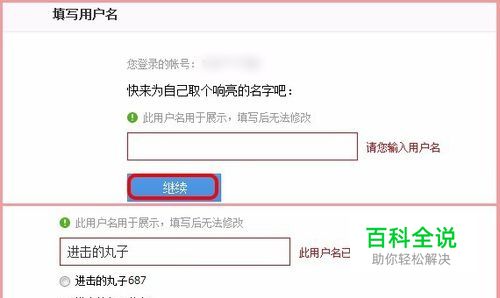 【继续】 百度帐号目前应该还是只能有一次机会, 输入好名字后点【继续】会筛选此昵称是否已经有人注册,有人注册就重新修改后再点【继续】,一直到能够修改成功为止。