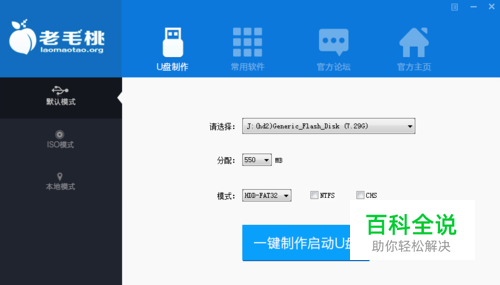 插入U盘,最好是有8G以上。现在的操作系统一般都在3-4G左右,保证U盘足够放镜像文件。打开老毛桃后会自动识别到插入U盘,如图所示。