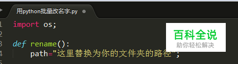 定义修改名称的函数rename。 在rename函数中定义一个储存路径的变量path,并将要修改文件名的文件夹的路径赋值给该变量。