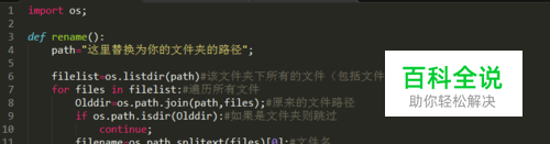 列出代码,便于复制 import os; def rename(): path="这里替换为你的文件夹的路径"; filelist=os.listdir(path)#该文件夹下所有的文件(包括文件夹) for files in filelist:#遍历所有文件 Olddir=os.path.join(path,files);#原来的文件路径 if os.path.isdir(Olddir):#如果是文件夹则跳过 continue; filename=os.path.splitext(files)[0];#文件名 filetype=os.path.splitext(files)[1];#文件扩展名 Newdir=os.path.join(path,"这里是你要改的文件名"+filetype);#新的文件路径 os.rename(Olddir,Newdir);#重命名 rename();