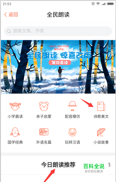 在全民朗读中选择自己喜欢的文字,这里选择的是诗歌美文模块,当然你也可以直接选择“今日朗读推荐”,进入诗歌美文后,详细找到一篇自己想朗读的文字 ,比如 “心无挂碍、无有恐惧”,点击朗读。