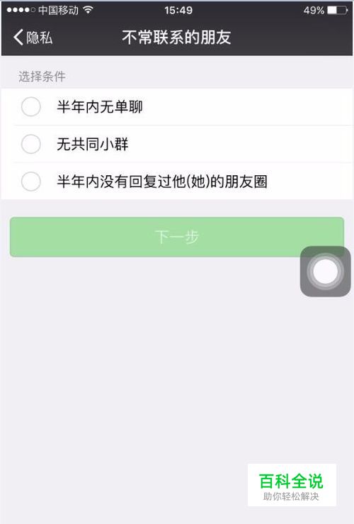 随便选择一个搜索条件, 【半年内无单聊】,在前面的选项点击后再点击下一步。