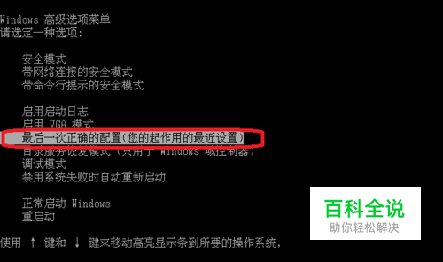 1、重新启动,快速按F8,如果到了还没有看到如下图,在得新启动按F8直到出现如下图为止。首先选择(最后一次正确的配置(您的起作用的最近设置)用箭头上下选择,这个可以试一试。