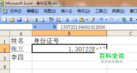 经常使用Excel登记个人信息,一般就是姓名、身份证号、出生日期、性别等,Excel中单元格默认为“数字”格式,输入长数字的身份证号时,单元格内显示的是科学记数法的格式,如图,怎么样正确输入身份证号呢?