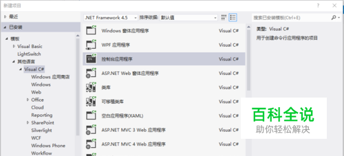 在弹出的“新建项目”的对话框中,左边选择“已安装”下的“其他语言”下的“Visual C#”,然后在中间的列表框中选择“控制台应用程序”选项,点击“确定”。