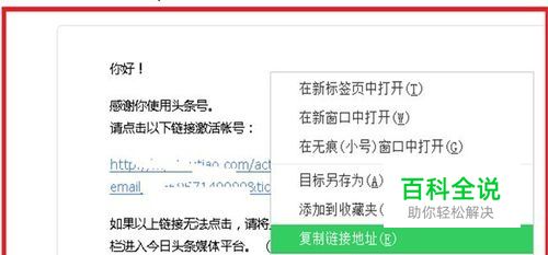 5、看到激活链接,鼠标指向链接,单击右键,单击复制链接地址,把地址粘贴到网址中,敲回车键。