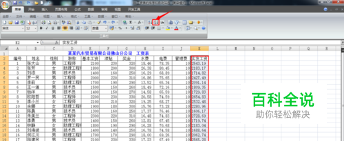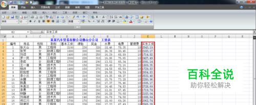 打开电子表格:举例:按实发工资排序,选中'实发工资"这一列