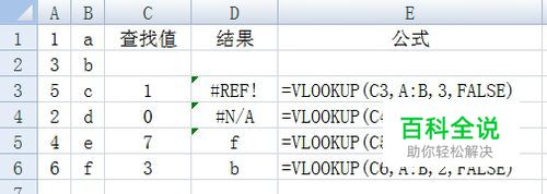 第二种可能性: 第三个参数设置不正确,比如VLOOKUP(lookup_value,table_array,col_index_num,range_lookup),第二个参数包含了3列,要得到的值在第3列,而第三个参数却设置成了2或4等情况,在这咱情况下第3个参数小于区域中的列数时函数返回“#VALUE!”,大于列数时函数返回“#REF!”。如下图中D3单元格的结果。