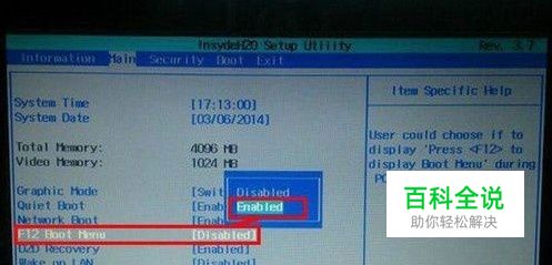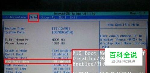 有的电脑没有启用F12快捷键,所以需要先到bios中打开F12快捷键功能,打开电脑出现开机画面时按F2进入BIOS界面,使用左右方向键将光标移至Main栏目,再使用上下方向键将光标移至F12 Boot Menu项,设置打开还是关闭F12快捷键功能,如下图所示: