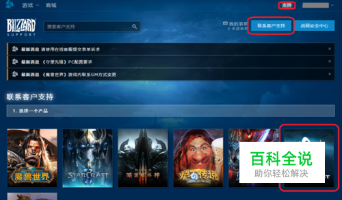 点击右上方【支持】,再点击【联系客户支持】,选择一个产品【战网】。