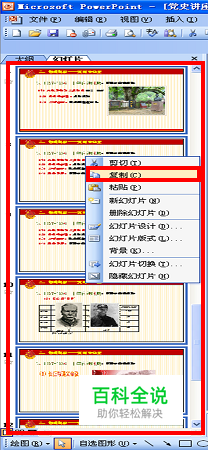 打开自己制作的ppt,全选ppt。具体做法:右击鼠标,选择复制。