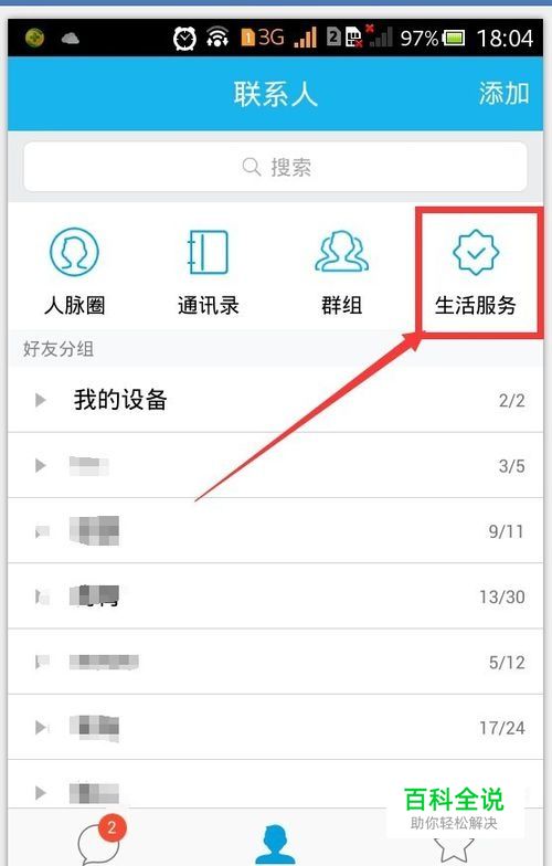 打开手机QQ,在联系人界面找到 生活服务