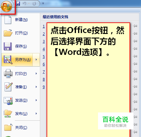首先,点击【Office按钮】,选择右下角的【Word选项】。