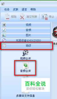 在格式工厂界面的左侧栏中选择“高级”选项卡中的“音频合并”按钮,进入音频合并对话空中