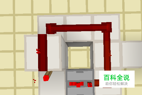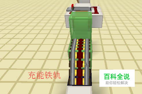 ·接通电路 我们在环与柱之间相连的那个方块上放置一个红石粉,这样就能接通整个电路,让刷铁轨机开始运作。