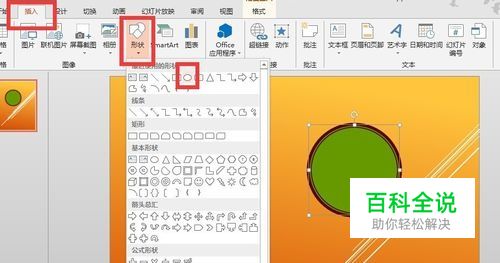 打开PPT,选择“插入”——“形状”——“圆形”(画圆的同时按住shift键)。