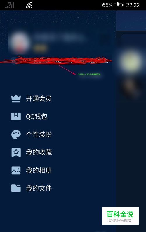 打开手机QQ,向右滑动界面,打开设置页面,点击头像下方的签名。