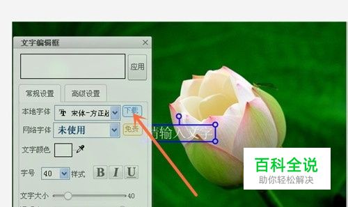 三、在“本地字体”中如果没有你想要的字体,你可以直接点击“下载”选项进行网络下载。下载成功后你就可以在刚才打开的对话框中的“文字编辑框”内利用你选中的字体输入文字了。