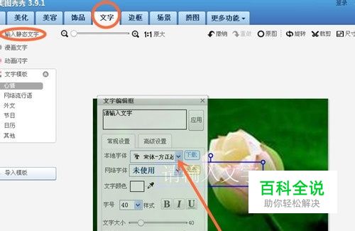 二、操作的方法是:在美图秀秀中打开你所选择的图片,在美图秀秀的菜单任务栏中选择“文字”选项,点击后在左侧选中“输入静态文字”选项,出现如下对话框。