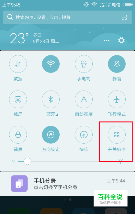从手机顶部划下,展开状态下拉菜单,在里面找到“ 开关排序”。