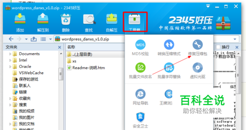 选择窗口上的工具箱选项,在里面找到修复压缩包