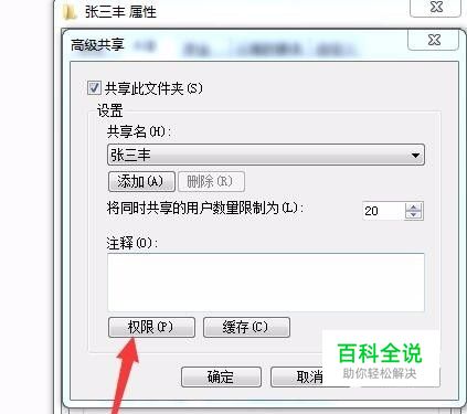 在新的对话框内,显示的是访问权限,我们点击权限,而后出现新的对话框