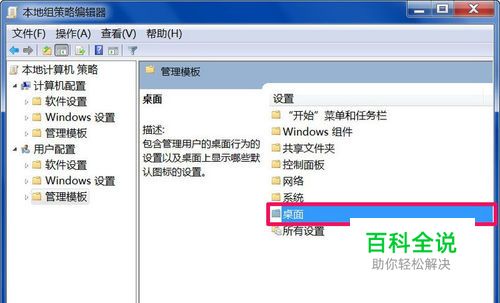 然后到管理模板的右侧窗口,找到“桌面”这一项,双击打开。