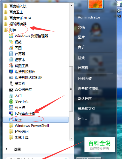 依次点击开始(电脑左下角的图标)-【所有程序】-【附件】-【运行】