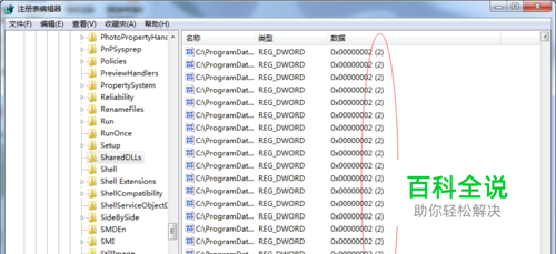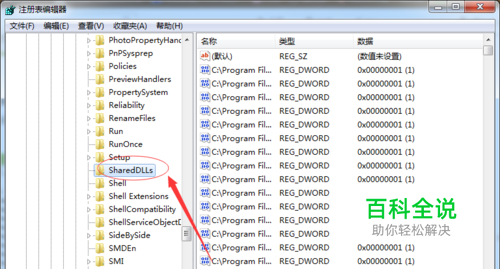在CurrentVersion文件夹找到SharedDLLs分支。在有侧找到所有键值为‘0’的项,右击并选择删除。