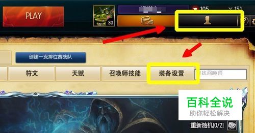 首先我们必须登陆自己的游戏账号,登陆后点击召唤师资料,如图具体的位置,点击进去。能够看到“装备设置”的栏目。