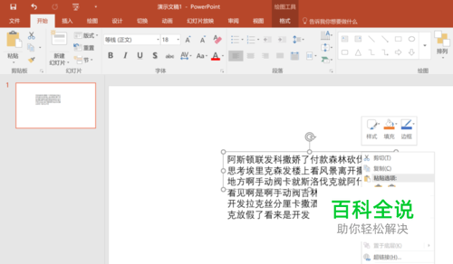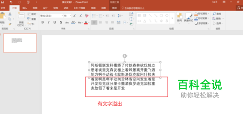 如果你在编辑PPT文档的过程中遇到了下图中的情况,即文本框中的文字超出了文本框,则可以通过下面的步骤进行设置。