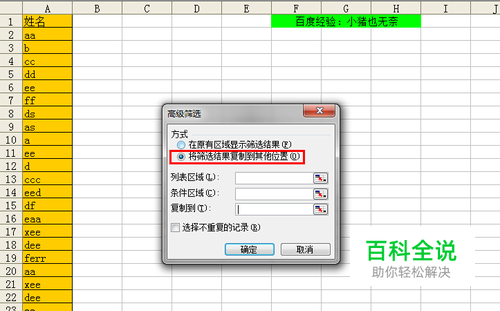 接下来,我们要做的就是选择操作的数据区域,设置数据的复制位置,最重要的就是勾选上“选择不重复的记录”。