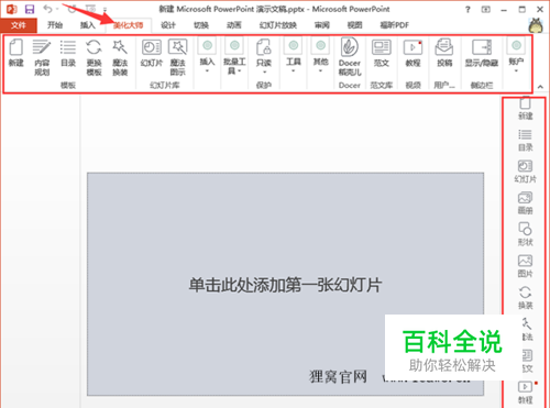 安装好ppt美化工具后双击打开,然后点击功能栏上的ppt美化工具,。在ppt的右侧也是有显示的,右侧的功能栏里面包含ppt美化工具的大部分功能,然后我将演示如何快速制作一个ppt。