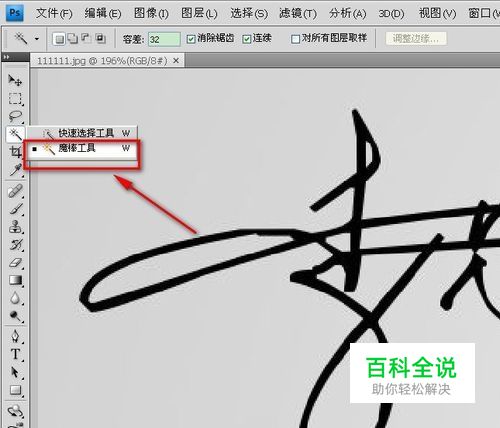打开Photoshop(下面简称PS)软件,选择【魔棒工具】→选中签名的黑色部分,如下图所示。