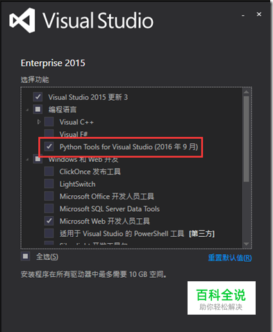 Visual Studio 2015安装包中已经集成了python编辑插件,其他低版本还是需要单独安装。在运行VS2015安装时,需要选择python Tools for Visual Studio ,如下图所示: