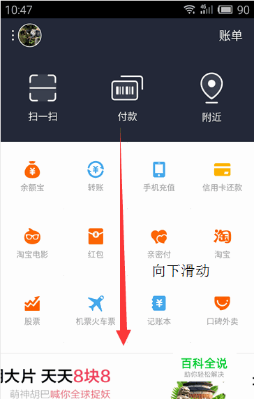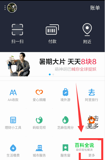 首先,打开支付宝“钱包”界面,我们看到一系列的应用窗口,接着,我们向下滑动手机屏幕,点击“更多”。
